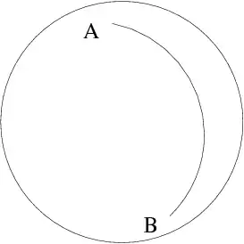 where is tensor depending on system's metrics (see [ph:relat:Misner73g] for more details). Equation eqdynarelatge is an evolution equation for a free particle. It is the equation of a geodesic. Figure figgeo represents the geodesic between two point A and B on a curved space constituted by a sphere. In this case the geodesic is the arc binding A and B.