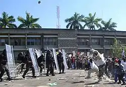 Confrontation between protesters and riot police during a Belizean riot, 2005.