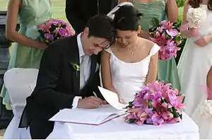 Marriage is a governmentally, socially, or religiously recognized interpersonal relationship, usually intimate and sexual, that is often created as a form of contract.[33] The most frequently occurring form of marriage is between a woman and a man, where the feminine term wife and the masculine husband are generally used to describe the parties to the contract. Other forms of marriage also exist. For example, polygamy, in which a person takes more than one spouse, is present in many societies.[34] (See, for instance, the Kaingang, of Brazil, where close to 40% of the marriages were not monogamous but included multiple spousal partners.) Currently, the legal concept of marriage is expanding to include same-sex marriage in some areas.[35]