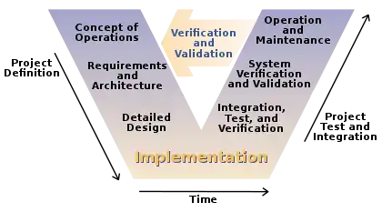The V-model represents a software development process (also applicable to hardware development) which may be considered an extension of the waterfall model. Instead of moving down in a linear way, the process steps are bent upwards after the coding phase, to form the typical V shape. The V-Model demonstrates the relationships between each phase of the development life cycle and its associated phase of testing. The horizontal and vertical axes represents time or project completeness (left-to-right) and level of abstraction (coarsest-grain abstraction uppermost), respectively.