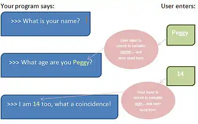For example, in a chat-bot program, I might invite the user to enter their name. Each time the program runs, I would store that name in a variable in my program called name.