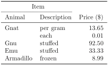 Many professionally typeset books and journals feature simple tables, which have appropriate spacing above and below lines, and almost never use vertical rules. Many examples of LaTeX tables (including this Wikibook) showcase the use of vertical rules (using "|"), and double-rules (using \hline\hline or "||"), which are regarded as unnecessary and distracting in a professionally published form. The booktabs package is useful for easily providing this professionalism in LaTeX tables, and the documentation also provides guidelines on what constitutes a "good" table.