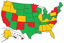 Red states in the map shown have substantial legislation in place, meaning vaping is banned along with smoking in most public places. California, Utah, New York and Hawaii ban vaporizors where traditional smoking is prohibited including bars, restaurants, offices, parks and beaches. In New Mexico and Minnesota, there are heavy taxes in place on vaping products. MInnesota doesn’t currently ban vaping in all public areas, but does have bans in place for hospitals, government buildings, and all college campuses, and it also requires child-resistant packaging for all e liquids sold as well as taxing vaping products as tobacco products. Yellow states have moderate legislation. These states ban the sale of vaporizor products to minors and have some cities that ban their use in public areas. Many of these states also have bans in place for college campuses. Green states have very limited legislation. Many of these states have no restrictions whatsoever on the sale or use of vaporizors, and some have only small restrictions such as sale to minors. [14]