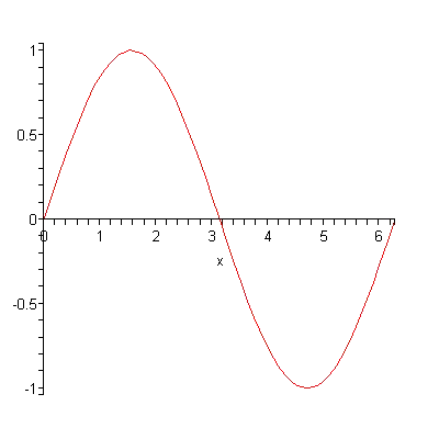 >plot(cos(x), x=0..2*Pi); #Image on the left >a:=Pi: #Affecting the variable a to equal pi >plot(sin(x), x=-a..a); #Image on the right