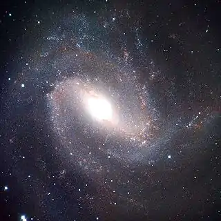 Messier 83 (also known as the Southern Pinwheel Galaxy, M83 or NGC 5236) is an w:intermediate spiral galaxy approximately 15 million w:light-years away in the w:constellation Hydra. It is one of the closest and brightest barred spiral galaxies in the sky, making it visible with w:binoculars. Six w:Supernovae (w:SN 1923A, w:SN 1945B, w:SN 1950B, w:SN 1957D, w:SN 1968L and w:SN 1983N) have been observed in M83.