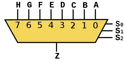 A multiplexer is an input selector. A multiplexer has an output, a control input, and several data inputs. For ease, we number multiplexer inputs from zero, at the top. If the control signal is "0", the 0th input is moved to the output. If the control signal is "3", the 3rd input is moved to the output.