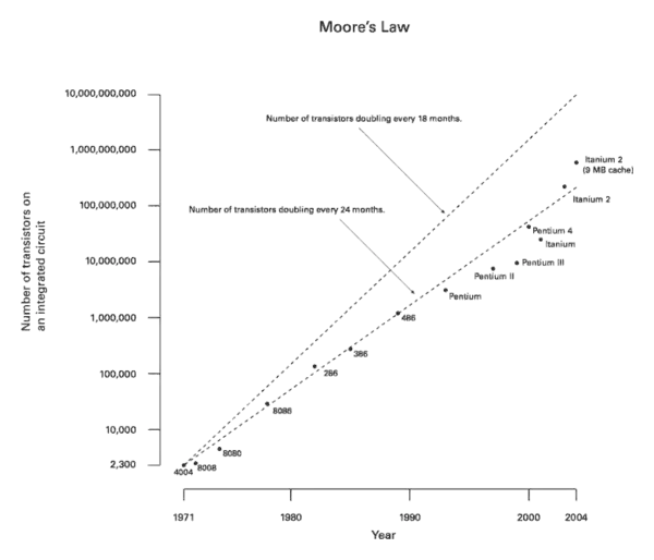 A common law that governs the world of microprocessors is Moore's Law. Moore's Law, originally by Dr. Carver Mead at Caltech, and summarized famously by Intel Founder Gordon Moore. Moore's Law states that the number of transistors on a single chip at the same price will double every 18 to 24 months. This law has held without fail since it was originally stated in 1965. Current microprocessor chips contain millions of transistors and the number is growing rapidly. Here is Moore's summarization of the law from Electronics Magazine in 1965:
