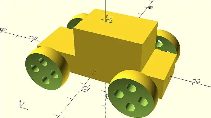 | Try removing some material from the wheels by subtracting four cylinders that are perpendicular to the wheel. The cylinders should be placed at half the wheel radius and be equally spaced. Introduce a cylinder_radius and a cylinder_height variable. The value of cylinder_height should be appropriate so that the cylinders are always longer than the thickness of the material they are removed from. |