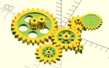 - gear(number_of_teeth, circular_pitch OR diametrial_pitch, pressure_angle OPTIONAL, clearance OPTIONAL)