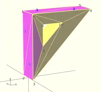 - Vector of faces that collectively enclose the solid. Each face is a vector containing the indices (0 based) of 3 points from the points vector.