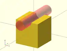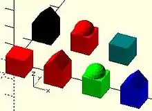 color("blue") { translate([5,3,0]) sphere(5); rotate([45,0,45]) { cylinder(10); cube([5,6,7]); } }
