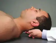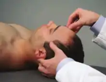 | Pareital lift | The patient is supine. The physician places the fingertips on both pareital bones and crosses the thumbs just above the sagittal suture, pressing one thumb against the other to provoke internal rotation of the parietal bones. The phsyician then lifts both hands cephalad until fullness is felt over the fingertips, thus inducing external rotation of the parietal bones. |  Parietal Lift |