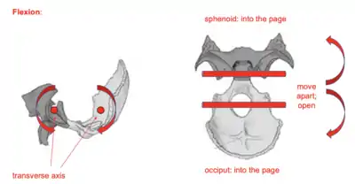 During flexion, the midline bones of the cranium (sphenoid, occiput, ethmoid, and vomer) move through a flexion phase. The paired bones of the cranial move through external rotation phase. Flexion at the SBS causes the dura to be pulled cephalad, moving the sacral base posterior through the superior transverse axis (at the level of S2) of the sacrum, which is known as counternutation, also known as sacral extension. Flexion will widen the head and slightly decrease the anteroposterior diameter.
