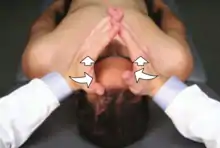 | Vault hold: | The patient is supine, about 8-10 inches from the edge. Physician contact on head is with fingers and palms of hands (no thumbs!) with the palms slightly molding to the head: