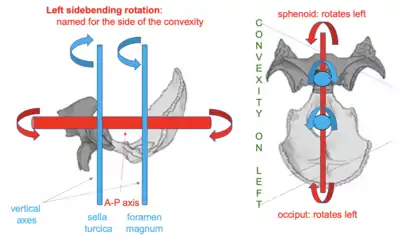 Physiologic dysfunctions also include torsion dysfunctions, which are rotations of the SBS along an anteroposterior (AP) axis with the sphenoid and occiput rotating in opposite directions and are named for the high greater wing of the sphenoid. Sidebending-rotation dysfunctions occur around three axes: sidebending of the sphenoid and occiput occurs around two vertical axes through the body of the sphenoid at the sella turcica and the foramen magnum in opposite directions and rotation of the sphenoid and occiput around an AP axis in the same direction. This dysfunction is named for the side of convexity of the sidebending curve. Rotation occurs toward the side of convexity of sidebending.