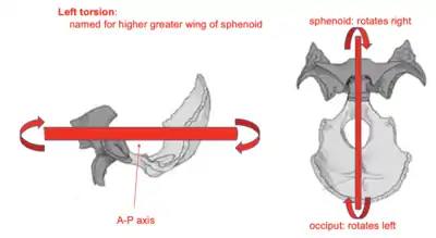 | Torsion | The sphenoid and occiput rotate in opposite directions around an anteroposterior (AP) axis |  Left Torsion Cranial Somatic Dysfunction Bone Motion | Relative to the dysfunctional side: