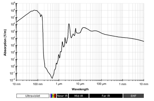 Water vapor (H2O) can absorb an enormous range of infrared wavelengths, with an absorption bands around 1,000 nanometers, 6,000 nanometers and any infrared light longer than 12,500 nanometers. In fact, microwave ovens work because water (H2O) has such a broad band of absorption of light wavelengths that extend out to long microwave lengths, of several centimeters.