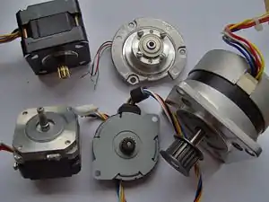 Stepper Motors are devices that turn a shaft by a small set angle (usually between 1 and 5 degrees) at a time. This is done very precisely, and so they are very useful for application requiring motion that does not have any feedback to govern the motor speed. However, they cannot be simply driven by a DC or AC voltage like simpler motors; they need more complex circuitry to drive them.