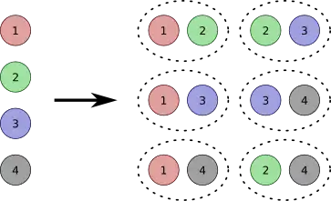Consider the integer set S = {1, 2, ... , n}. A combination is a subset of S. We emphasize that a combination differs from a permutation in that elements in a combination have no specific ordering. The 2-element subsets of S = {1, 2, 3, 4} are {1, 2}, {1, 3}, {1, 4}, {2, 3}, {2, 4}, {3, 4} , whereas the 2-permutations of S are more numerous with (1, 2), (1, 3), (1, 4), (2, 1), (2, 3), (2, 4), (3, 1), (3, 2), (3, 4), (4, 1), (4, 2), (4, 3) . There are therefore fewer 2-element subsets of S than 2-permutations of S.