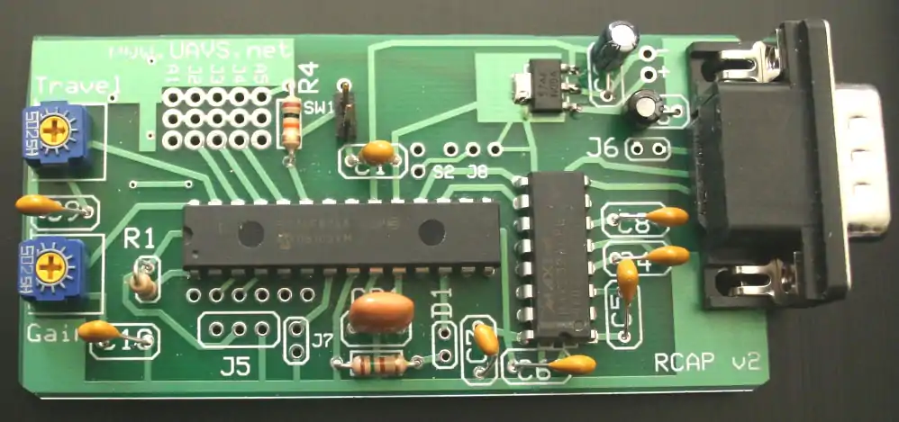 The RCAP2 is a Remote Control AutoPilot for model airplanes, cars and boats. The autopilot function can be switched off or on during flight with the flick of a switch. For it to function, a NMEA capable GPS (with either an OEM GPS for new firmware being developed rcgroups thread, or with programmable goto/waypoints functions) must be connected to the serial input port of the RCAP2.