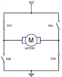 Both pairs of switches ( (S1A,S1B) and (S2A, S2B) )-see the picture on the right- will always switch together. This circuit is called an H-bridge. In a real design the switches can be several different components (Relays, transistors, FETs) or the whole circuit (without the motor) could be an IC (integrated circuit). use sugarcan relays