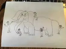 - The facilitator briefly shares what is going on in the image. Each blind person feels a different part of the elephant's body; and exclaims “It’s a spear, It’s a snake, It’s a wall, It’s a tree stump, It’s a fan, It’s a rope”.