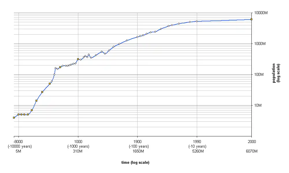 The development of property rights, division of labor, organized trade, accumulation of wealth, and taxation all came out of the Neolithic Revolution. They produced an economic system with recognizable elements that persist to this day. World population was on the order of 5 million at the start of the agricultural transition. By the time iron production became widespread, about 1000 BC, it had grown to about 50 million, and by the time of Classical Greece to 150 million. The much larger population led to more rapid improvements in technology, including in economic systems. The general trend of population growth and accelerated change has continued to the present day, with occasional setbacks. Figure 2.0-3 shows population history on a non-linear scale, to better show the dramatic changes in both speed and numbers. Each labeled division on the axes is a factor of ten in time (horizontal) and total population (vertical).