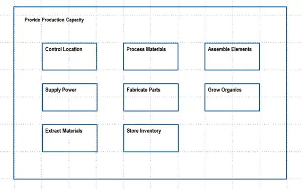 - Resources - Long term ratio of materials and energy production/internal needs of 10.5:1. Assigned to production function. Surplus production goes to location growth or sold for income.