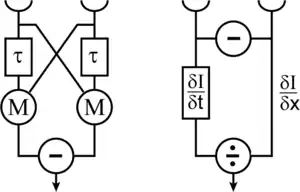 Two different mechanisms for motion detection. Left) A "Reichardt detector" consists of two mirror-symmetrical subunits. In each subunit, the luminance values as measured in two adjacent points become multiplied (M) with each other after one of them is delayed by a low-pass filter with time-constant τ. The resulting output signals of the multipliers become finally subtracted. Right) In the gradient detector, the temporal luminance gradient as measured after one photoreceptor (δI/δt, Left) is divided by the spatial luminance gradient (δI/δx). Here, the spatial gradient is approximated by the difference between the luminance values in two adjacent points.