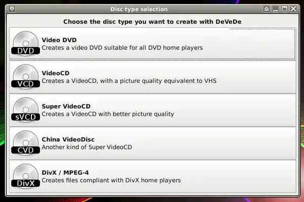 Using DeVeDe you can create video DVD, VCD, sVCD, CVD and DivX.