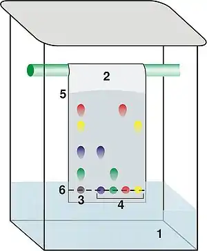 A light pencil line is drawn approximately 7 mm from the bottom of the plate and a small drop of a solution of the dye mixture is placed along the line. To show the original position of the drop, the line must be drawn in pencil. If it was drawn in ink, dyes from the ink would move up the TLC plate along with the dye mixture and the results would not be accurate. In order to get more accurate results, dot the TLC paper with the dye mixture a few times trying to build up material without widening the spots. A spot with a diameter of 1 mm will give good results. While dotting the TLC plate, be sure to not dot mixtures too close to one another because when the dye mixture rises up the TLC plate, it will clash with the other spots and the Rf values will be difficult to calculate.