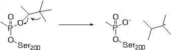 Inhibitors of AChE target active Ser-200 and deacylate extremely slowly causing prolonged occupation of the enzyme’s active center and prevent it from hydrolyzing acetylcholine. Organophosphates (OP) and carbamates (CM) are the primary classifications of drugs that irreversibly inhibit AChE. OPs and CMs are frequently found in pesticides; some OPs can also be found in nerve warfare agents. [3] Exposure to OPs or CMs is quickly followed by continuous contraction of affected muscles as acetylcholine neurotransmitter floods the synapse, this results in muscular paralysis, convulsions, and typically death by asphyxiation once the nerve agent has spread to the diaphragm. exposure is typically treated with oximes, however, the drug typically remains intercellularly and is capable of reinhibiting AChE; a primary focus of research is devoted to developing more reactive oximes for faster reactivation of AChE as well as discovering different pathways of reactivation . OPs are particularly lethal because they undergo an additional reaction called aging. Aging is a dealkylation step that results in an anionic phopho-conjugate that is unresponsive to oxime reactivation. [4] The cation produced by aging is stabilized by the same 14 aromatic residues in the lining of the gorge that stabilize acetylcholine's cation.
