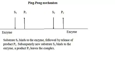 In the Ping Pong mechanism substrate S binds to the enzyme transferring a chemical component to the active site making a modified enzyme. Once substrate S leaves active site substrate T can bind and react with the newly modified active site. Once the newly formed product leaves the enzyme it returns to its original state ready to accept substrate S.