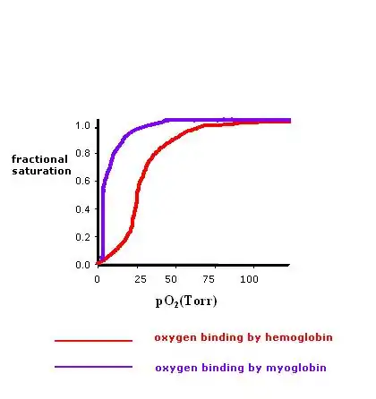 This image shows hemoglobin's oxygen binding affinity compared with myoglobin's affinity and the hypothetical curve that hemoglobin would have to follow if it did not show cooperativity. In this graph, you can see hemoglobin's sigmoidal curve, how it starts out with a little less affinity than myoglobin, but comparable affinity to oxygen in the lungs. As the pressure drops and the myoglobin and hemoglobin move towards the tissues, myoglobin still attains its high affinity for oxygen, while hemoglobin, because of its cooperativity, suddenly loses its affinity, therefore making it the better transporter of oxygen than myoglobin. The gray curve, showing no cooperativity, shows that to have the low affinity for oxygen needed in the tissues, the hemoglobin would have started with a smaller affinity for oxygen, therefore making it less efficient in bringing oxygen in from the lungs.