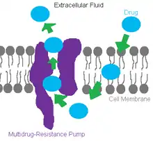 These MDR pumps not only work in bacteria, but unfortunately, also in cancerous cells. The cancerous cells can fend off the chemotherapy drugs by pumping them out of the cell, allowing evasion of cell death.[1]
