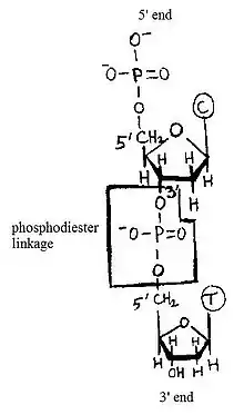 In the molecular bonding of the deoxyribonucleotide (DNA) and ribonucleotide(RNA), phosphodiester bond is a strong covalent bond between a phosphate group and two 5-carbon ring. The phosphate group contains a negative charge as it bonds to a 3' carbon in one ring and a 5' carbon in another ring.