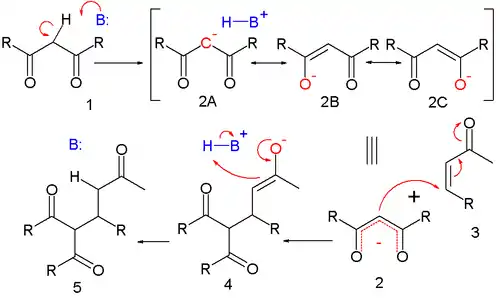 The Michael reaction is the nucleophilic addition of a carbanion or another nucleophile to an alpha, beta unsaturated carbonyl compound. The stabilized anions derived from β-dicarbony compounds with α,β-unsaturated carbonyl compound leads to 1,4-additions. It is one of the most useful methods for the mild formation of new carbon-carbon bonds. A Michael addition is base-catalyzed and works with α,β-unsaturated ketones, aldehydes, and other carboxylic acid derivatives; they are known as Michael acceptors. A Michael donor is an electron-withdrawing group on the nucleophile such acyl and cyano. [Vollhardt]