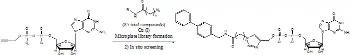 These techniques have been extremely useful in combinatorial drug development. The product of the azide-alkyne cycloaddition, triazole, is favorable in drug design because it possesses a variety of useful properties. The highly tuned properties of these reactions possessing high yields, selectivity, and ability to undergo transformation in mild (biological) environments allow the products to be directly analyzed for activity without purification (which is a significant shortcut!). Example of direct screening of click chemistry products with alpha-1,3-fucosyltransferase (fuc-T) show below.