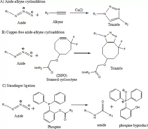 The ability of generating molecular modification with high selectivity is invaluable for studies of chemical and biological systems. Click chemistry is the chemical philosophy of synthesizing molecules from a core group of highly effective reactions developed by Sharpless, Finn, and Kolb in 2001. The inspiration for the development of Click chemistry came from the idea that nature tends to produce substances from smaller subunits. The logic behind click chemistry is to bind small molecular units together to produce products with reactions that proceed rapidly in high yields under ambient conditions. These reactions are required to have a high thermodynamic driving force that is orthogonal to other functional groups that may be present in biomolecules. Click chemistry reactions are effective for labeling biomolecules. They also proceed in biological conditions with high yield. An important aspect of the reactions is that they are bioorthogonal, meaning that they don’t react with functional groups in the biological systems. Some examples of Click chemistry reactions are (a) Azide-Alkyne Cycloaddition, (b) Copper-Free Azide Alkyne Cycloaddition, and (c) Staudinger Ligation shown in the schemes below.