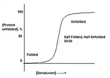 For instance, if a protein is put in a denaturant where only one part of the protein is unstable, the entire protein will unfold. This is due to the domino effect where destabilizing one part of the protein will in turn destabilize the remainder of the structure. When a protein is in conditions which correspond to the middle of the transition between folded and unfolded, there is a 50/50 mixture of folded and unfolded protein, instead of 'half-folded' protein.