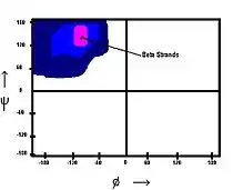 Beta sheets are graphically found in the upper left quadrant of a Ramachandran plot. This corresponds to ψ angles of 0° to 180° and Φ angles of -180° to 0°.