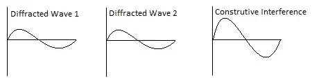 Constructive interference indicates that the diffracted x-rays are in phase or lined up with each other, while destructive interference indicates that the x-rays are not exactly in phase with each other. The result is that the measured intensity of the x-rays increases and decreases as a function of angle and distance between the detector and the crystal.
