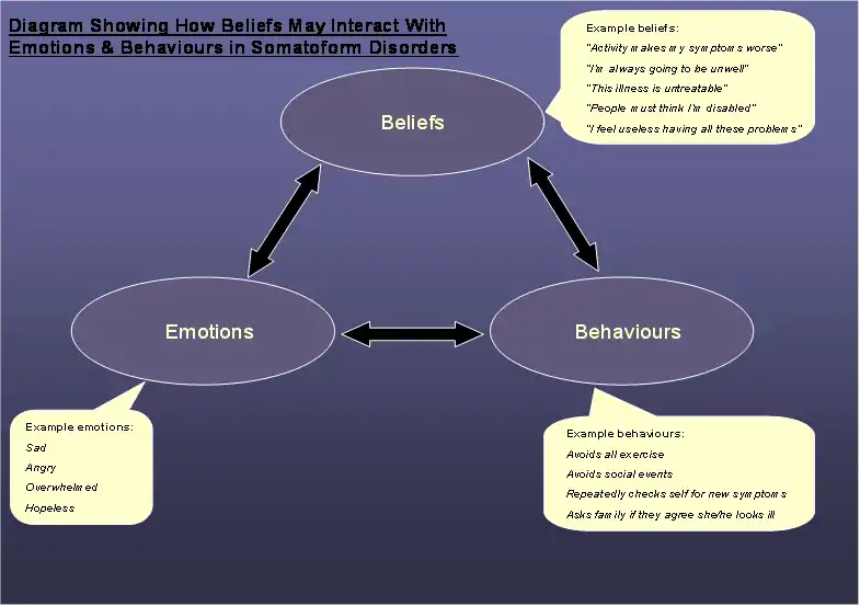 Overall cognitive behavioural therapy (CBT) is known to be an efficacious treatment for the range of the conditions loosely grouped under the somatoform disorders (Sumathipala, 2007). CBT and similar therapies have shown specific usefulness in the treatment of hypochondriacal disorder (Thomson and Page, 2007), CFS/ME (Chambers, Bagnall et al. 2006), irritable bowel syndrome (Brandt, Bjorkman et al. 2002), fibromyalgia (Rossy, Buckelew et al. 1999) and burning mouth syndrome (Zakrzewska, Glenny et al.). CBT can be adapted for use in any of these disorders, but like most medical treatments relies on the patient being sufficiently motivated to participate. One of the first goals in CBT is for the therapist and patient to come to a shared understanding of the patient’s problems using a CBT framework – the therapist often uses diagrams like the one on page 18 to illustrate this. Evidence is lacking for useful psychotherapeutic treatments for conversion disorder (Martlew, Baker et al. 2007), although preliminary studies have shown that, once again, CBT may be useful (Goldstein, Deale et al. 2004).