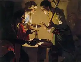 Just as Jacob left, Esau returned from the hunt, prepared a dish for Isaac, and asked Isaac for his blessing. Isaac asked who he was, and Esau said that it was he. Isaac trembled and asked who it was then who had served him, received his blessing, and now must remain blessed. Esau burst into sobbing, and asked Isaac to bless him too, but Isaac answered that Jacob had taken Esau’s blessing with guile. Esau asked whether Jacob had been so named that he might supplant Esau twice, first taking his birthright and now his blessing. Esau asked Isaac whether he had not reserved a blessing for Esau, but Isaac answered that he had made Jacob master over him and sustained him with grain and wine, and asked what, then, he could still do for Esau. Esau wept and pressed Isaac to bless him, too, so Isaac blessed him to enjoy the fat of the earth and the dew of heaven, to live by his sword and to serve his brother, but also to break his yoke.