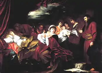 When Isaac was old and his sight had dimmed, he called Esau and asked him to hunt some game and prepare a dish, so that Isaac might give him his innermost blessing before he died. Rebekah had been listening, and when Esau departed, she instructed Jacob to fetch her two choice kids so that she might prepare a dish that Jacob could take to Isaac and receive his blessing. Jacob complained to Rebekah that since Esau was hairy, Isaac might touch him, discover him to be a trickster, and curse him. But Rebekah called the curse upon herself, insisting that Jacob do as she directed. So Jacob got the kids, and Rebekah prepared a dish, had Jacob put on Esau’s best clothes, and covered Jacob’s hands and neck with the kid’s skins.