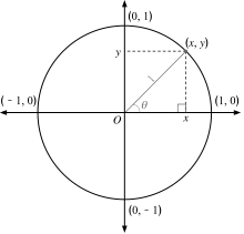 Draw a line of unit length, , from the origin to a point that is angled anti-clockwise from the horizontal axis. Then, indicate a line parallel to the vertical axis and a line parallel to the horizontal axis from the point .