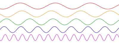As an alternative to specifying the frequency, the number of cycles in unit distance, we can instead specify the wavelength, the length of one cycle. The higher the frequency, the shorter the wavelength. The lower the frequency the longer the wavelength.