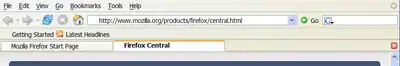 Tabs are featured underneath the Location and Bookmarks Toolbars, in a file folder-like layout. Tabs allow users to have one Firefox window in the taskbar, with multiple web pages open within that window. In the image, the default Firefox homepage is shown in the first tab, and Firefox Central (accessed from the "Getting Started" bookmark) is shown in the second. The number of tabs that can be opened at any one time is unlimited, though the tab bar can only hold around 20 tabs comfortably. Also, Firefox does not display the tab bar unless more than one tab is open (there is an option to change this).