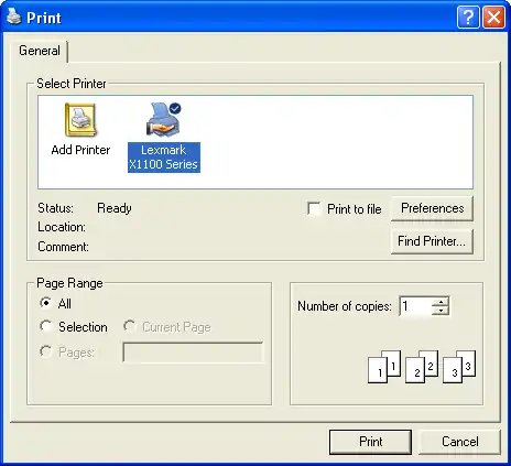 The print dialog box allows the user to select how output should be printed. Options and properties accessible to the user includes the amount of copies to make, print quality, the range of pages to print, ect. It also allows the user to choose another printer, as well as configure different settings regarding the current printer.