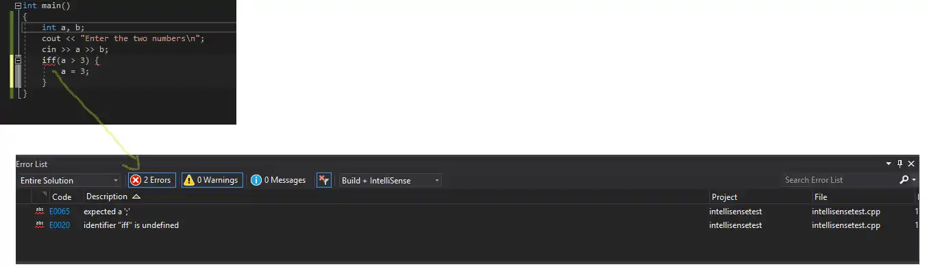 Obviously illogical. However, IntelliSense reports the error as “expression must be a modifiable lvalue”. While some of them would be very hard to diagnose, IntelliSense reports the line numbers wherever possible, and hence you can use that to pinpoint the problem.